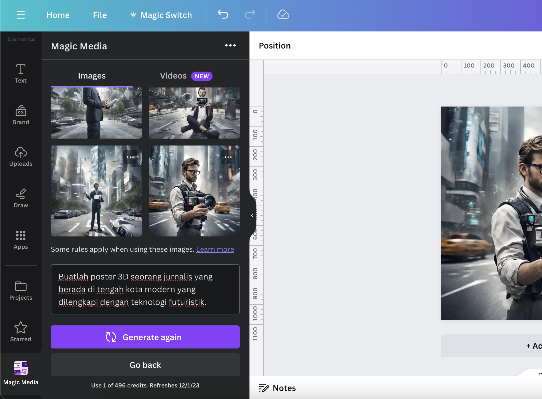 Namun, bukan hanya Bing Image Generator saja, platform desain lain seperti Canva juga bisa menciptakan karya seni serupa. Seperti diketahui, setelah adanya pembaruan besar-besaran pada ulang tahunnya yang ke-sepuluh, Canva telah menghadirkan banyak fitur yang didukung oleh teknologi AI. Seperti, fitur Magic Media ini.