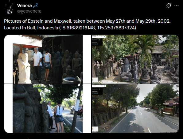 Perhatian semakin besar setelah sebuah unggahan dari akun media sosial X, @geovenera, pada Minggu, 1 Februari 2026, menyertakan foto Epstein dan Maxwell yang disebut diambil antara 27 hingga 29 Mei 2002. Dalam foto itu, Epstein terlihat mengenakan kemeja putih dan celana hitam, sedang berada di sebuah galeri patung. Berdasarkan analisis koordinat lokasi yang dibagikan, keduanya diketahui berada di kawasan Batubulan, Kabupaten Gianyar, Bali.