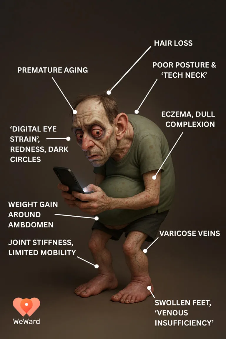Sebuah simulasi dari aplikasi pelacak langkah WeWard menunjukkan gambaran mengerikan tentang bagaimana tubuh manusia dapat berubah pada tahun 2050, jika kebiasaan malas gerak (mager) dan kecanduan gadget terus berlangsung. Sosok tersebut diberi nama Sam — representasi manusia masa depan dengan penampilan yang mengalami banyak perubahan akibat gaya hidup sedentary.