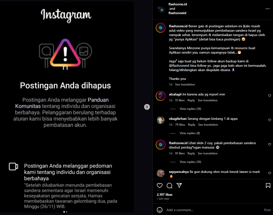 sandera Israel dihapus oleh Instagram. Admin akun tersebut menyatakan bahwa