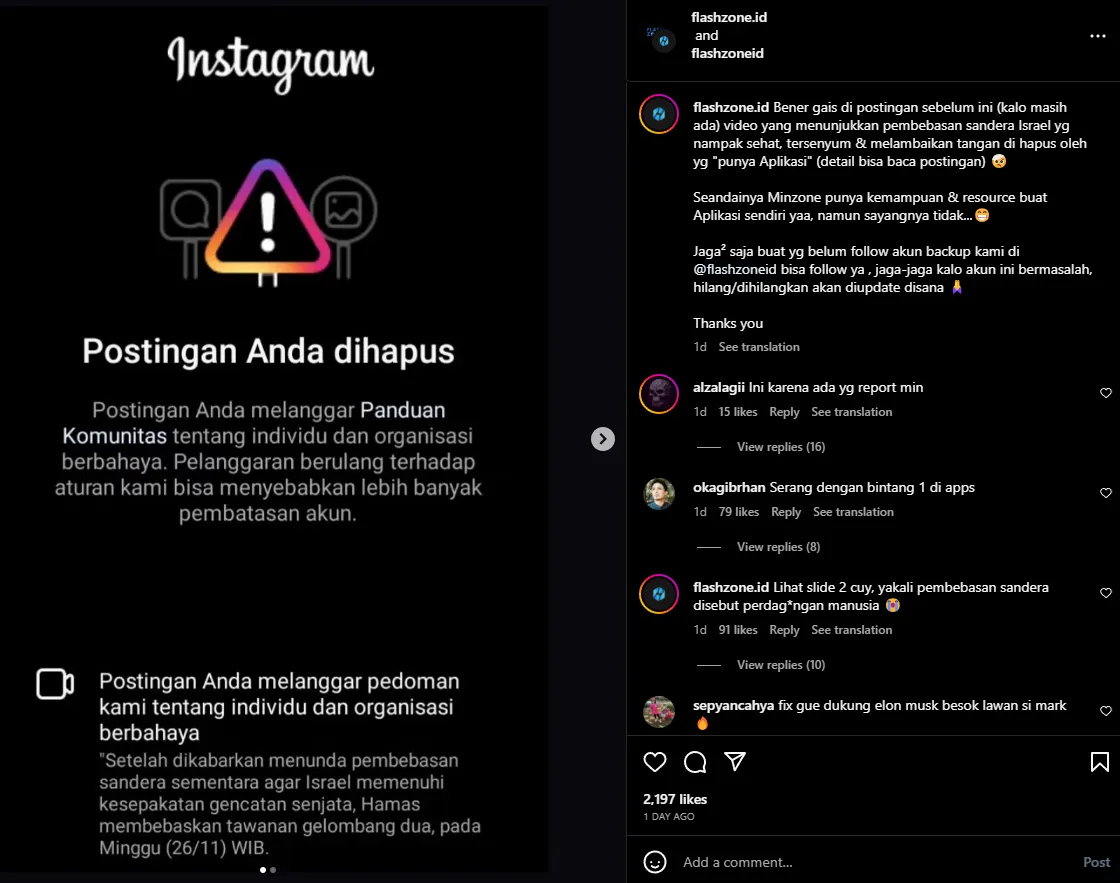 Teknologi.id - Sejumlah pengguna Instagram di Indonesia mengalami kesulitan dalam me-repost konten terkait situasi Palestina, termasuk Reels dan IG Story, yang diunggah oleh beberapa akun. Beberapa pengguna melaporkan bahwa saat mencoba me-repost konten tersebut di IG Story, postingan mereka langsung dihapus oleh Instagram.
