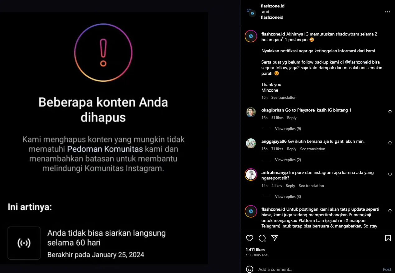juga menimbulkan shadowban selama dua bulan bagi akun flashzone.id. Shadowban