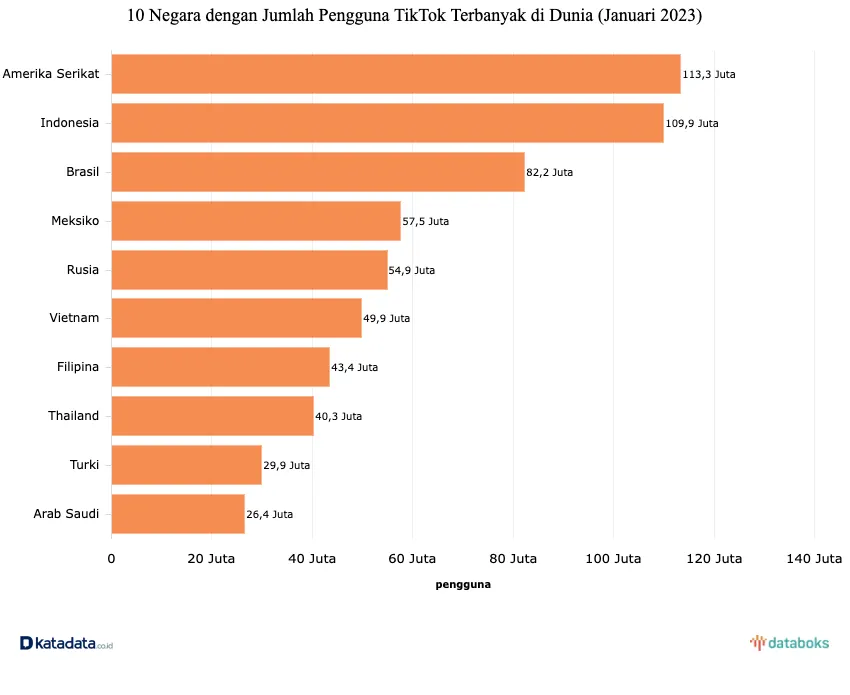 Data Survei 10 Negara dengan Jumlah Pengguna TikTok Terbanyak di Dunia. Foto: Databoks - Katadata