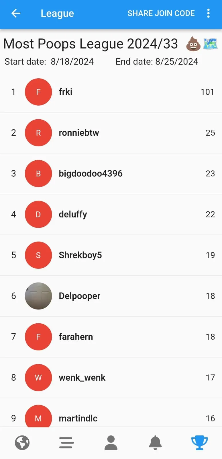 Ketika masuk pada liga tersebut, Anda akan bersaing seberapa sering BAB. Terdapat jangka waktu untuk yang telah ditentukan untuk menentukan pemenang pada liga tersebut.