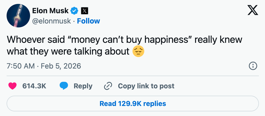 Poin paling menohok dari laporan ini adalah pengakuan langsung dari Elon Musk sendiri. Sering kali, kita mendengar pepatah "Uang tak bisa membeli kebahagiaan" sebagai kalimat penghibur bagi mereka yang tidak kaya. Namun, ketika kalimat itu keluar dari mulut orang terkaya di planet ini, maknanya menjadi sangat literal dan menyedihkan.
