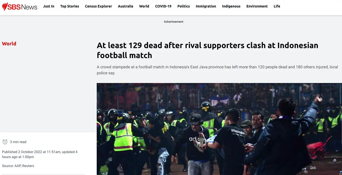 SBS News, media asal Australia memuat berita berjudul "At least 129 dead after rival supporters clash at Indonesian football match" (Sedikitnya 129 Tewas Setelah Pendukung Lawan Bentrok di Pertandingan Sepak Bola Indonesia).
