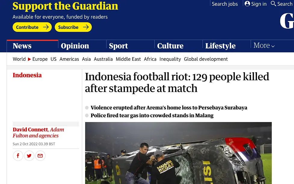 Menurut The Guardian, kerusuhan pecah setelah Arema kalah dari Persebaya Surabaya dan polisi dilaporkan menembakkan gas air mata ke tribun penonton di Stadion Kanjuruhan Malang. Dalm artikel juga disebutkan bahwa Liga Indonesia akan dihentikan sementara selama seminggu akibat tragedi memilukan tersebut.