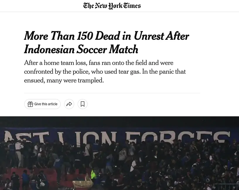 The New York Times memberitakan kerusuhan di Stadion Kanjuruhan Malang dengan judul "More Than 100 Dead in Unrest After Indonesian Soccer Match" (Lebih dari 100 Tewas dalam Kerusuhan Usai Pertandingan Sepak Bola Indonesia). Dalam pemberitaan disoroti penggunaan gas air mata oleh polisi yang mengakibatkan kepanikan sehingga banyak korban yang terinjak-injak.