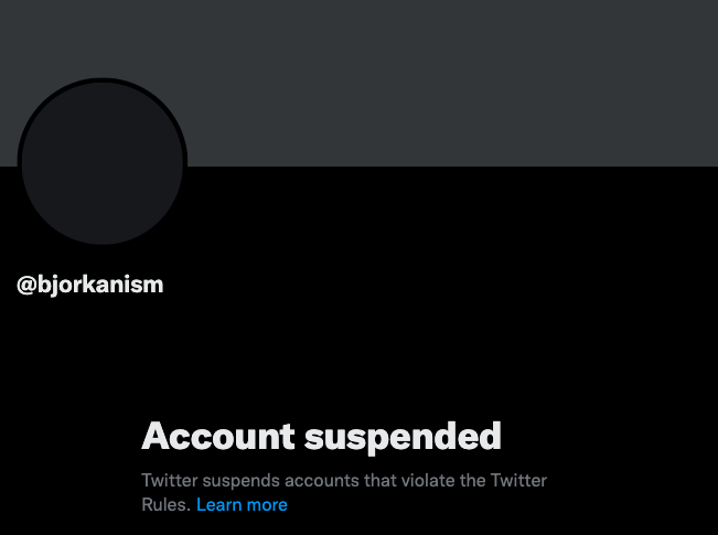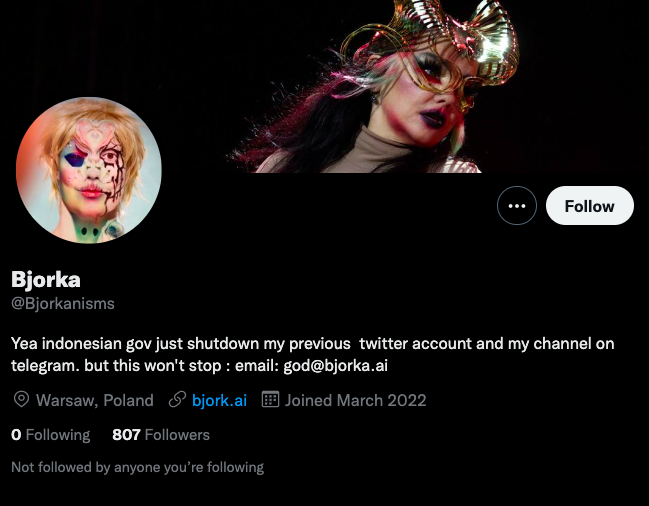 "ya pemerintah indonesia baru saja menutup akun twitter saya dan saluran saya sebelumnya di telegram. tapi ini tidak akan berhenti," tulis akun Twitter @Bjorkanism dengan menggunakan Bahasa Inggris.