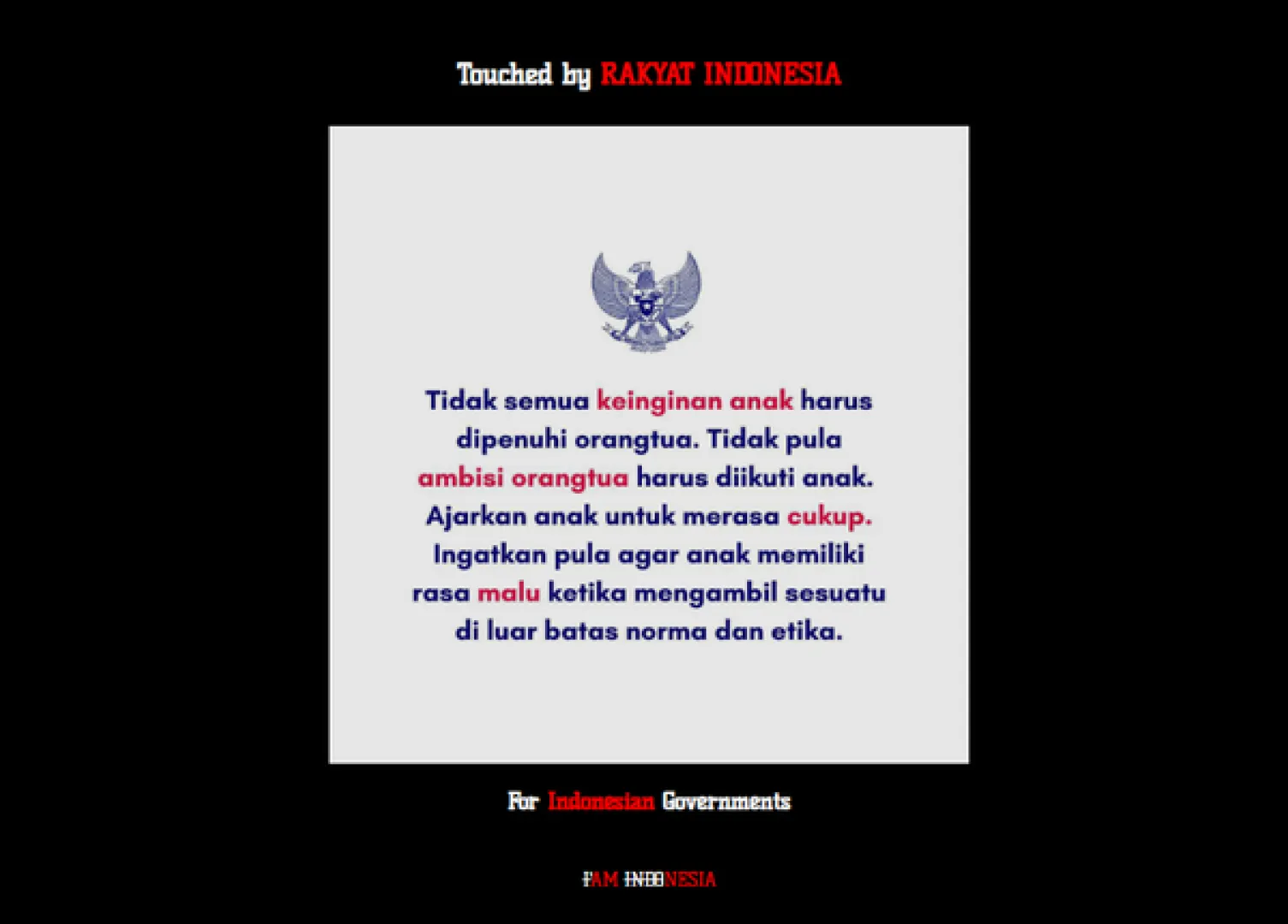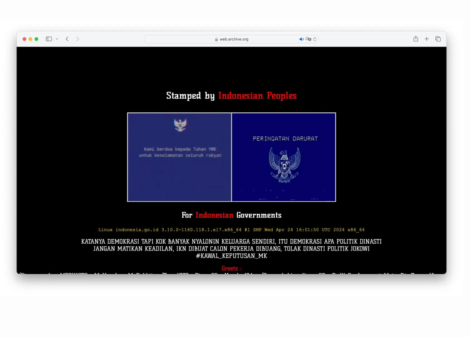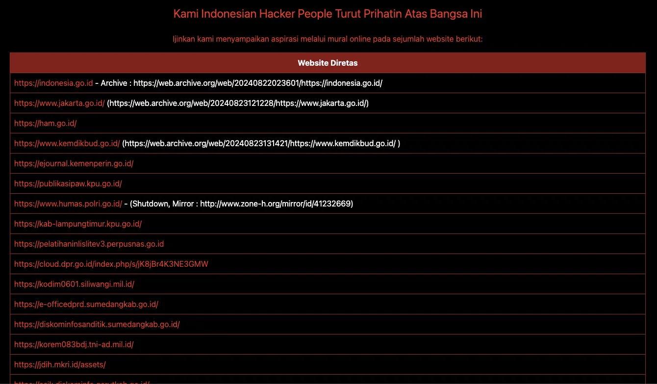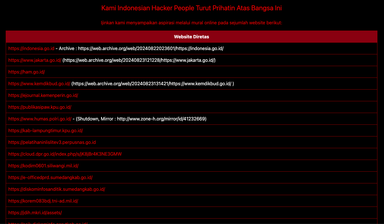 Teknologi.id - Beberapa situs pemerintah Indonesia diduga menjadi sasaran peretasan oleh sekelompok hacker. Salah satu yang dilaporkan adalah situs resmi Portal Informasi Indonesia, indonesia.go.id. Saat situs ini diretas, tampilan halamannya berubah menjadi latar hitam yang diiringi musik instrumental lagu Wajib Nasional "Gugur Bunga". Di halaman tersebut, terdapat tulisan "Stamped by Indonesian Peoples" yang ditempatkan di atas poster "Peringatan Darurat" dengan gambar Burung Garuda berlatar biru.