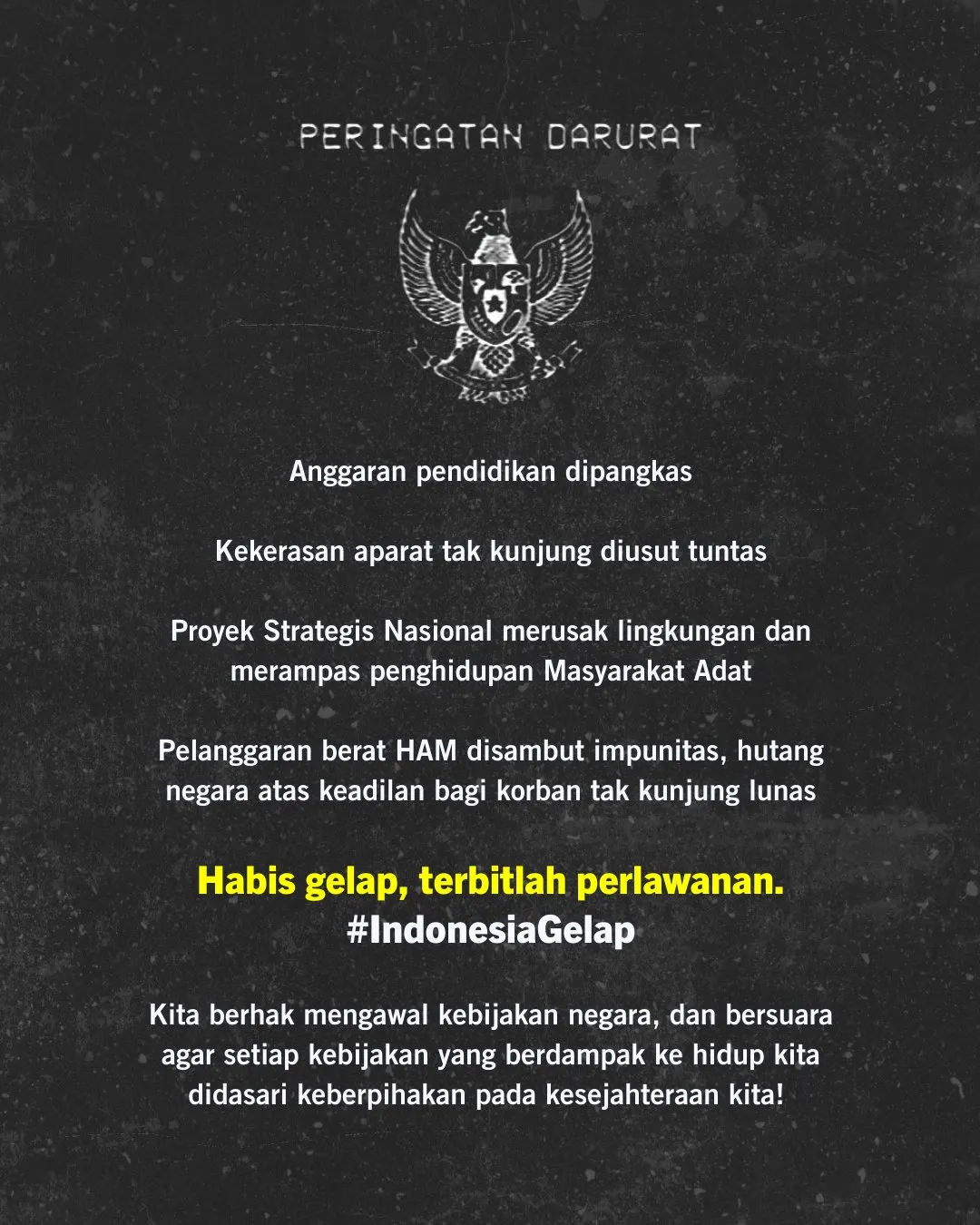 "Ketika masa depan bangsa diliputi kegelapan akibat kebijakan yang tidak memihak rakyat, maka diam bukan pilihan! #IndonesiaGelap"