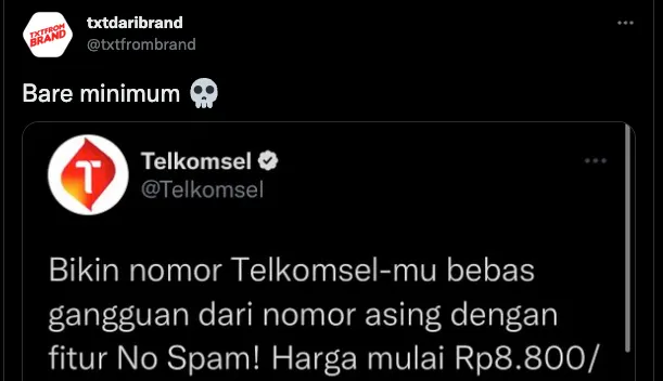 "Bikin nomor Telkomsel-mu bebas gangguan dari nomor asing dengan fitur No Spam! Harga mulai Rp8.800/bulan atau Rp2.200/7 hari aja, bisa blokir nomor telepon yang mengganggu tanpa diketahui nomor tersebut," tulis akun Twitter resmi Telkomsel yang diunggah ulang oleh @txtfrombrand.