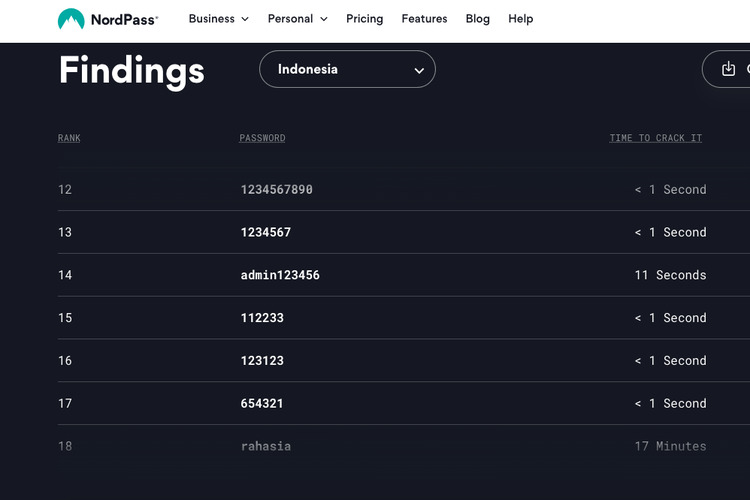 Untuk Indonesia, kombinasi kata "admin" dan angka urut seperti ini berada di urutan ke-14 paling banyak digunakan, dengan waktu rata-rata pembobolan hanya sekitar 11 detik.