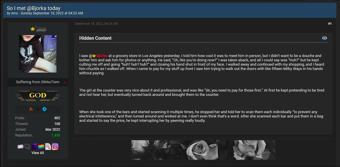 "Saya bertemu Bjorka di pusat perbelanjaan di Los Angeles kemarin. Saya memberitahu kepadanya, seberapa keren saya bisa bertemu dengan dia sebagai orang (asli) tapi saya tidak mau mengganggu dia dengan memintanya untuk berfoto bersama," ujar Emo.