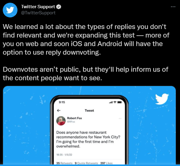 Berdasarkan keterangan resmi dari akun @TwitterSupport, sebelumnya fitur downvote ini merupakan eksperimen terhadap bagaimana para pengguna bereaksi terhadap tweet dan reply yang tidak relevan atau bahkan menyinggung.