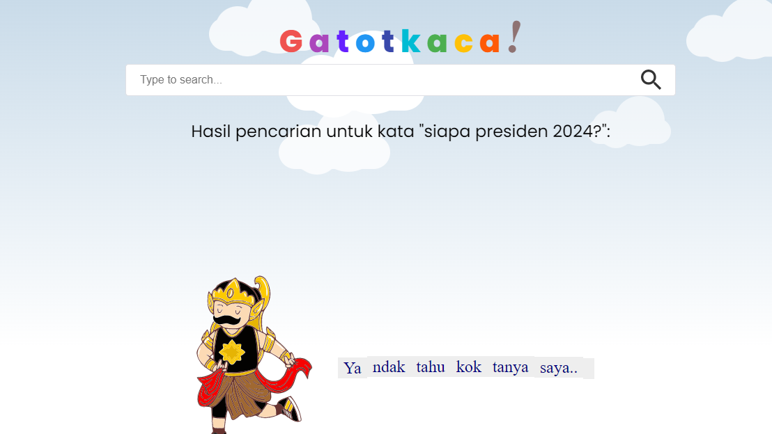Bukannya informasi yang didapatkan layaknya mesin pencarian pada umumnya, mesin pencari Gatotkaca justru menjawab dengan informasi yang menjadi salah satu ucapan yang fenomenal dari presiden Indonesia kita saat ini dalam sebuah wawancaranya. Tulisannya menampilkan tulisan 'ya ndak tau kok tanya saya.'