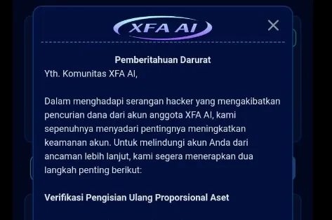Setelah adanya kejadian tersebut para pengguna yang menjadi korban mendapat notifikasi dari admin XFA AI. Notifikasi tersebut memberi instruksi kepada para korban untuk melakukan verifikasi keamanan agar bisa mengamankan dan menarik kembali dana mereka. Namun para korban diharuskan terlebih dahulu untuk melakukan pengisian saldo atau top up dana.