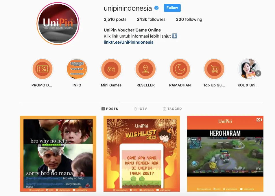 Kamu juga bisa follow Instagram @unipinindonesia. Di sana juga sering diupdate promo-promo terbaru UniPin. Selain itu juga banyak konten menghibur seputar gaming yang bisa kamu dapatkan. Jadi pastikan kamu follow dan buka terus Instagram UniPin ya.