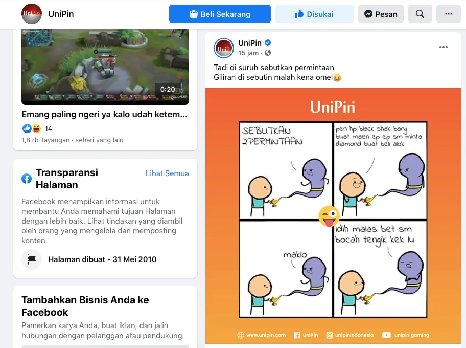 Nah cara yang kelima, kamu juga bisa ikuti Facebook UniPin. Selain bisa ikuti promo-promo terbaru, kamu juga bisa dapat hiburan dari berbagai konten menarik. Salah satunya meme gaming yang banyak tersedia. Dijamin kamu akan selalu seru dan terhibur. Cek saja langsung Facebook UniPin.