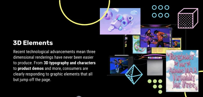Dengan kemajuan teknologi, kini sudah kian sangat mudah untuk menghasilkan rendering berbentuk tiga dimensi. Kita dapat mengharapkan tahun 2023 untuk memiliki logo, halaman web, dan lainnya yang hadir dengan elemen 3D yang membuat yang melihat tertarik dan tetap berada dihalaman website Anda. Rendering akan menciptakan dampak dalam hal-hal seperti tipografi dan penambahan karakter.