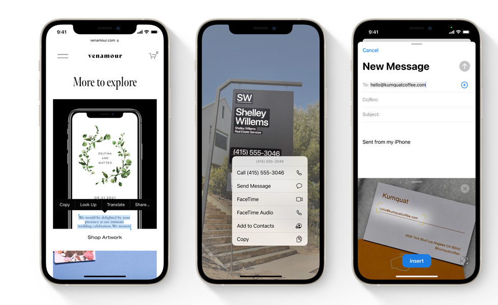 Melalui fitur ini, pengguna bisa mengubah teks yang ada di dalam foto dan menyalin ke gadget pengguna. Sehingga pengguna tidak perlu bersusah-susah lagi untuk mencatat ulang teks. Live Text akan langsung dengan cerdas membuka informasi yang ada di dalam foto sehingga pengguna dapat melakukan panggilan, mengirim email, atau mencari petunjuk arah hanya dengan satu ketukan pada teks yang disorot di foto.