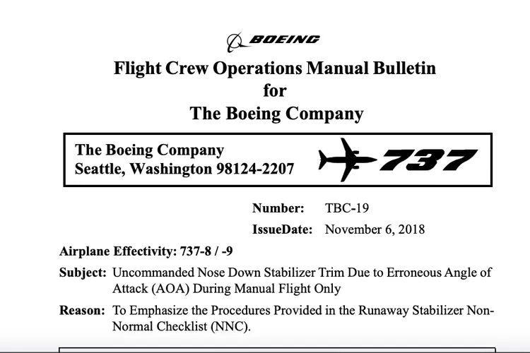Buletin panduan operasional untuk kru Boeing 737 MAX 8 ini diterbitkan oleh Boeing dan FAA, berdasarkan fakta awal yang ditemukan oleh KNKT dalam penyelidikan jatuhnya pesawat Lion Air JT 610.