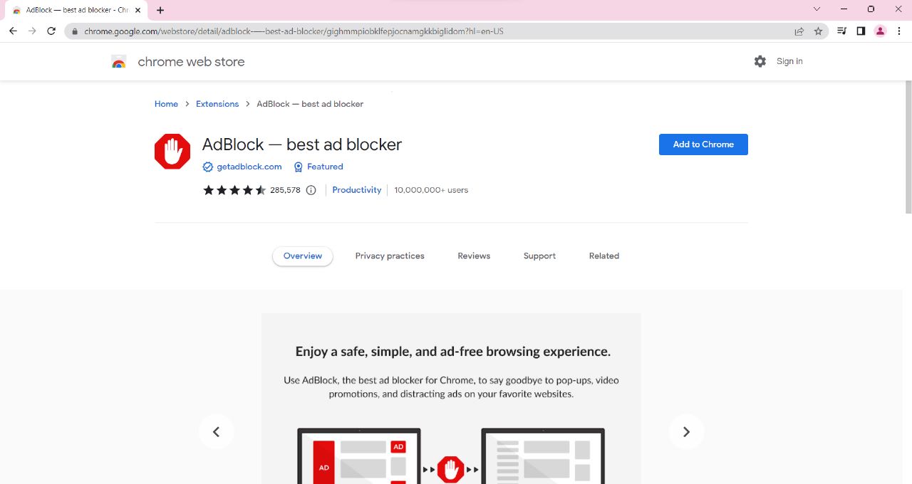 - Klik "Add to Chrome" pada ekstensi AdBlock yang tepat