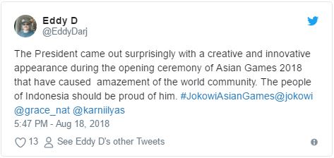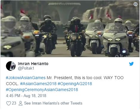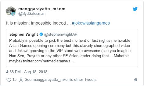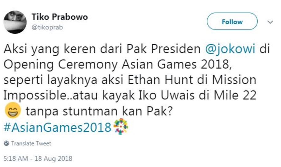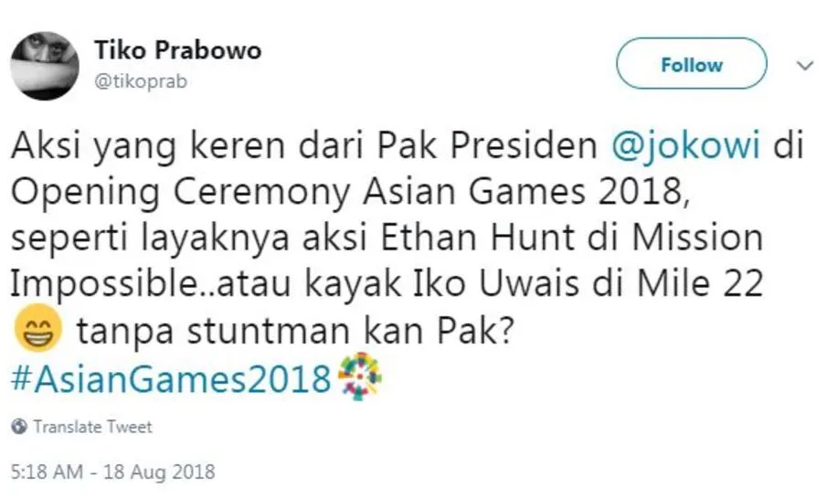 Sebagian warganet menganggap aksi Presiden RI Ke-7 itu keren bahkan patut disandingkan dengan aktor sekelas Tom Cruise. Beberapa warganet lainnya menganggap pembukaan Asian Games kemarin sudah setara dengan level Olimpiade.