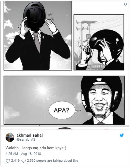 Bahkan seorang netizen dengan kreatif menggambarkan komik terkait aksi Jokowi dalam pembukaan Asian Games tersebut.