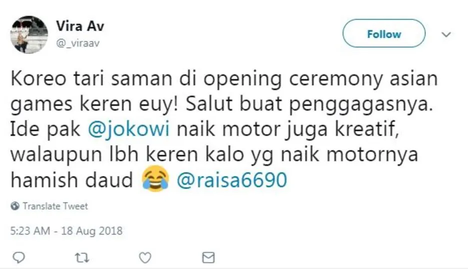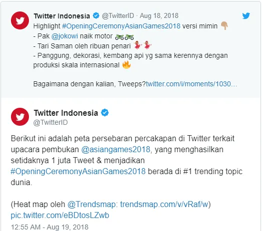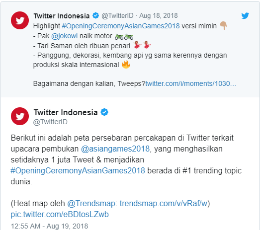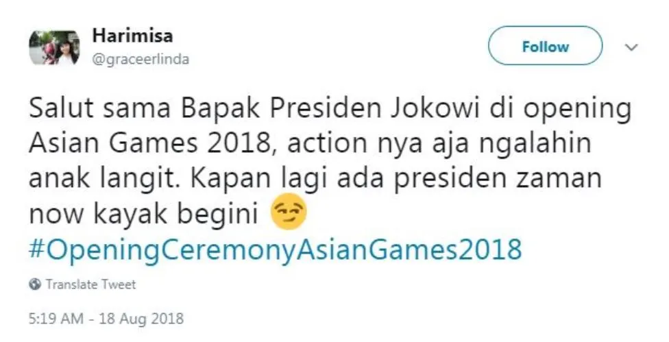Menurut Twitter Indonesia, setidaknya 1 juta kicauan netizen dari seluruh dunia meramaikan media sosial dengan tagar #OpeningCeremonyAsianGames2018 dan #JokowiAsianGames. Berikut Teknologi.id rangkum cuitan-cuitan kocaknya.