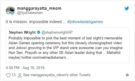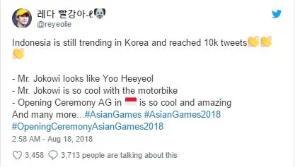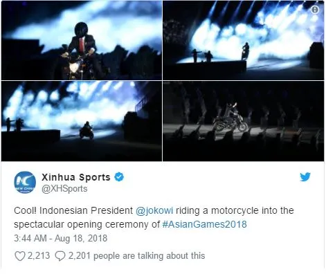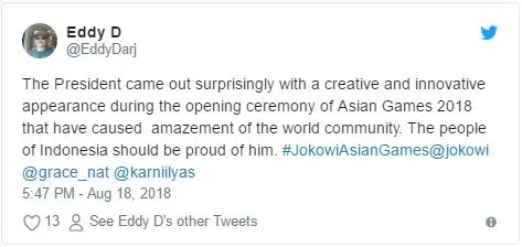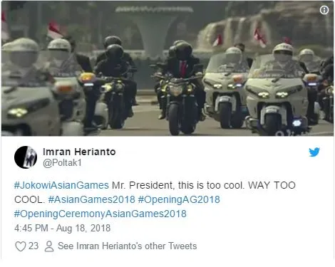 Selain membuat decak kagum penonton, aksi Jokowi malam itu juga meramaikan media sosial. Di Twitter, penampilan Jokowi itu sempat memuncaki trending topic dunia termasuk Indonesia dengan tagar #OpeningCeremonyAsianGames2018 dan #JokowiAsianGames.