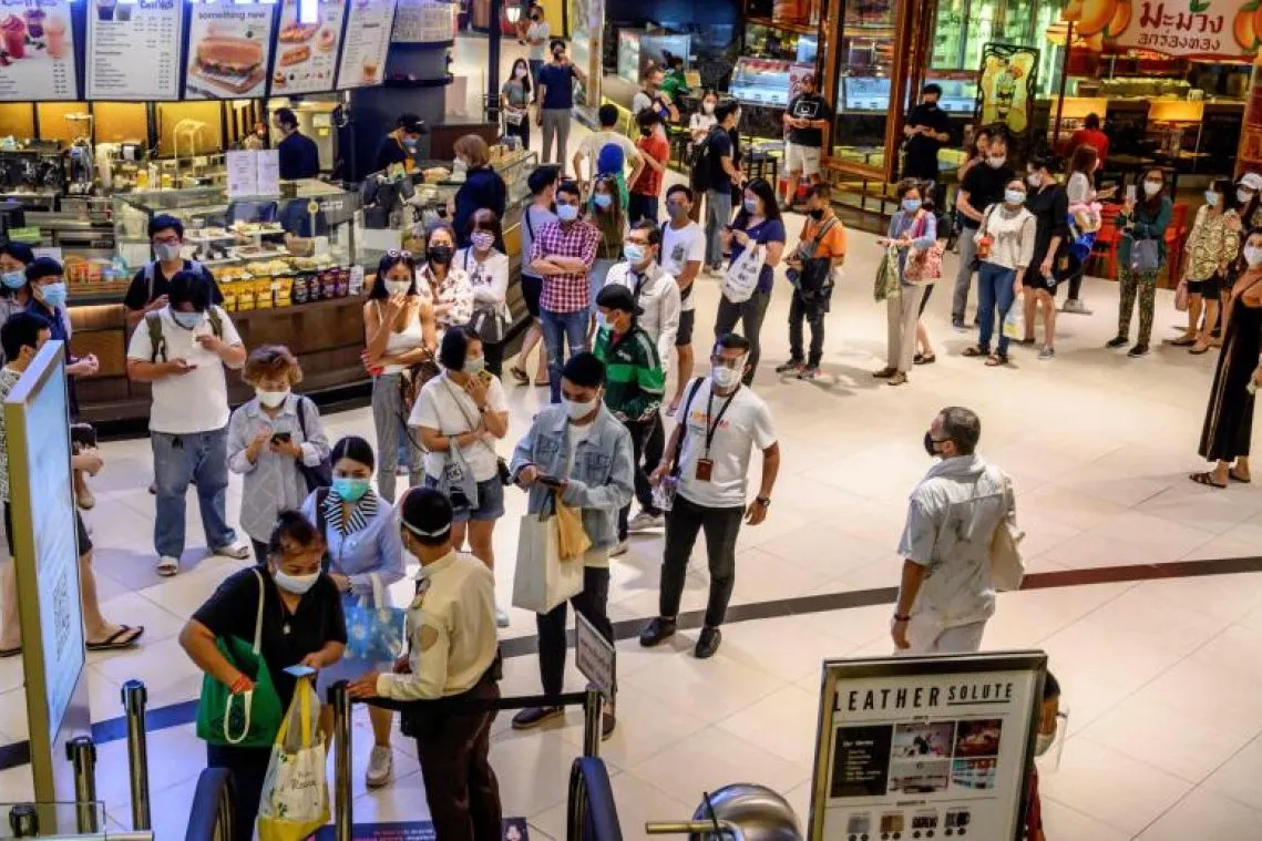 Alhasil, masyarakat pun berbondong-bondong datang ke pusat perbelanjaan di Thailand hingga harus mengantre saat melalui pemeriksaan suhu tubuh di pintu masuk.