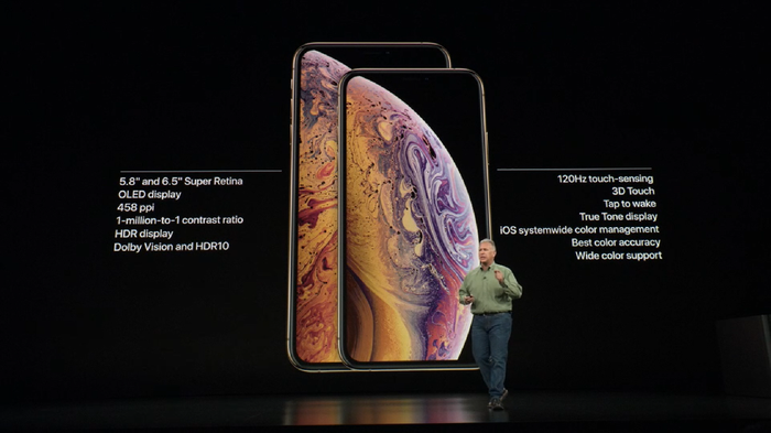 iPhone XS dan XS Max mengusung layar Super Retina berjenis OLED dengan kerapatan 458 ppi. Layar iPhone XS beresolusi 2.436 x 1.125 piksel dengan kerapatan 458 ppi, sementara layar iPhone XS Max beresolusi 2.688 x 1.242 piksel.