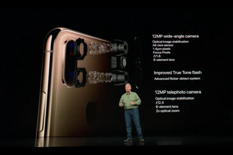 Beralih ke sektor kamera, iPhone XS dan XS Max memakai modular ganda (dual-camera) pada bagian belakang. Kedua kamera beresolusi 12 megapiksel, satu dengan lensa wide angle dan lainnya untuk telephoto.