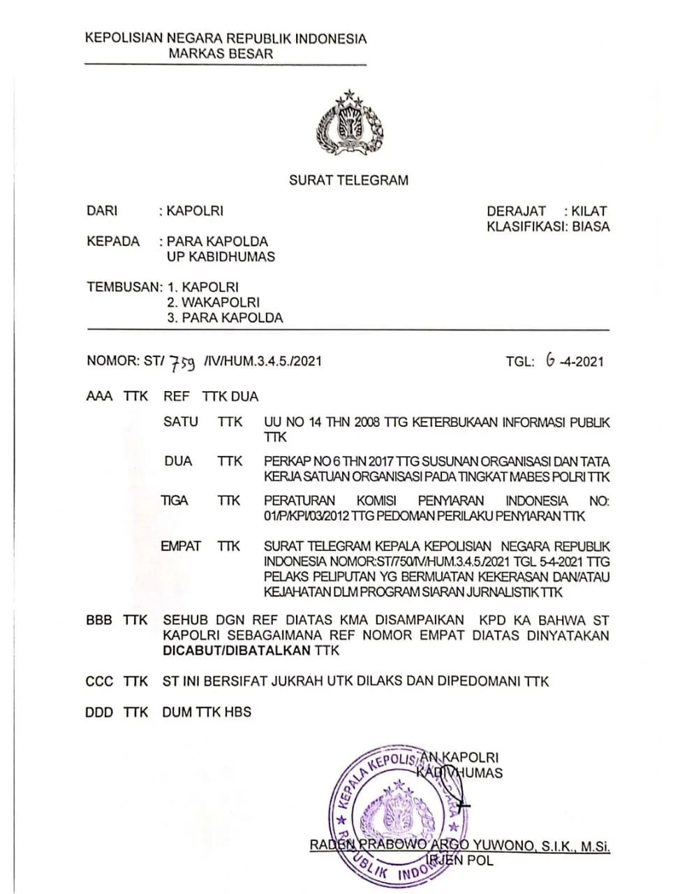 "SEHUB DGN REF DI ATAS KMA DISAMPAIKAN KPD KA BAHWA ST KAPOLRI SEBAGAIMANA RED NOMOR EMPAT DI ATAS DINYATAKAN DICABUT/DIBATALKAN TTK," demikian bunyi surat telegram tersebut.
