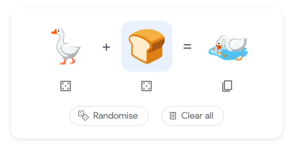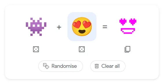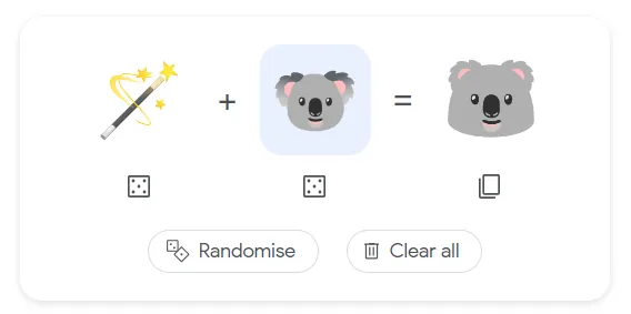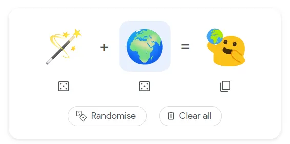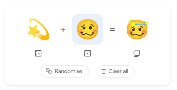 FINALLY Baca Juga: Ini Emoji yang Paling Banyak Digunakan di 2021 Cara Bermain Emoji Kitchen di Google Search Bukan hanya asyik, memainkan Emoji Kitchen juga sangat mudah. Kalian cukup klik salah satu emoji untuk menggantinya dengan emoji lain yang tersaji dalam daftar. Jika bingung, kalian bisa klik kotak-kotak berbentuk dadu di bawah emoji untuk mengacak (random) emoji yang dipakai, atau bisa juga acak kedua emoji sekaligus dengan tombol Randomize. Jika ingin mengulang dari awal, klik Clear all. Untuk menyalin emoji hasil campuran, kalian bisa klik ikon Copy pada hasil kombinasi emoji dan menempelnya dalam format gambar .png.