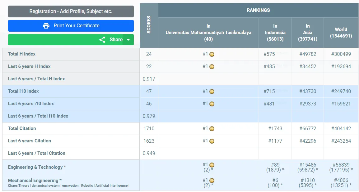 Dengan hasil skor yang tertera di bawah, Aceng Sambas menempati peringkat #1 Universitas, #575 Indonesia, #49782 Asian, dan #300499 Dunia secara keseluruhan subjek yang termasuk ke dalam kategori AD Scientific Index 2023.