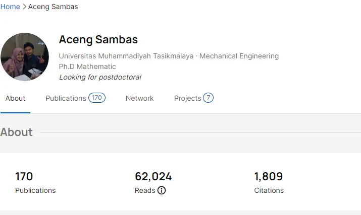 Teknologi.id - Aceng Sambas menjadi Dosen di Universitas Muhammadiyah Tasikmalaya (Umtas) menempati peringkat 79 'Indonesia Top 10.000 Scientist' kategori Subjek Engineering & Technology. Pemeringkatan ini dilakukan oleh AD Scientific Index yang merupakan sistem pemeringkatan dan analisis tahunan berdasarkan kinerja ilmiah dan produktivitas dari sebuah universitas dan/atau seorang ilmuan.