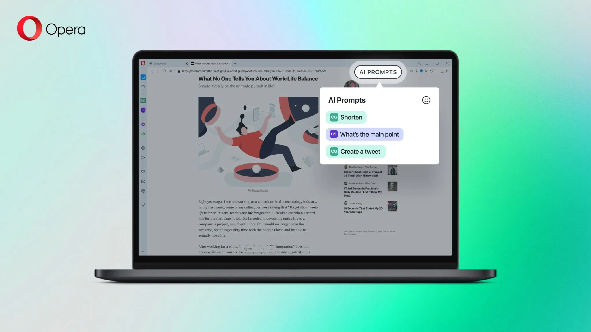 Menurut blog dari Opera, mereka akan membawa serangkaian fitur baru yang dinamakan AI Prompts serta memberikan akses sidebar ke ChatGPT dan ChatSonic. Fitur ini akan memberikan pengalaman baru dalam menjelajah internet yang lebih interaktif dan mengagumkan. Layanan generatif berbasis kecerdasan buatan atau Artificial Intelligence-Generated Content (AIGC) sedang mengubah bentuk web sehingga pengguna dapat menikmati pengalaman menjelajah yang lebih canggih dan memungkinkan pengguna untuk merasakan kekuatan super dalam menjelajah.