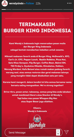 Teknologi.id - Beberapa hari yang lalu, media sosial Indonesia dihebohkan dengan sebuah unggahan berisi ajakan untuk memesan makanan dari sejumlah gerai makanan cepat saji dan restoran lainnya di akun Instagram resmi Burger King Indonesia (burgerking.id). Wendy's yang menjadi salah satu restoran yang disebutkan oleh Burger King Indonesia pun merespons baik dengan mengunggah ucapan terima kasih melalui post Instagram Story di akun Instagram resminya (wendysindo).