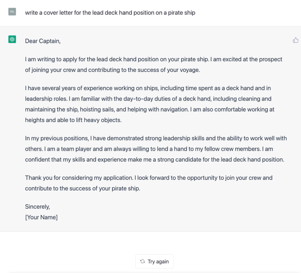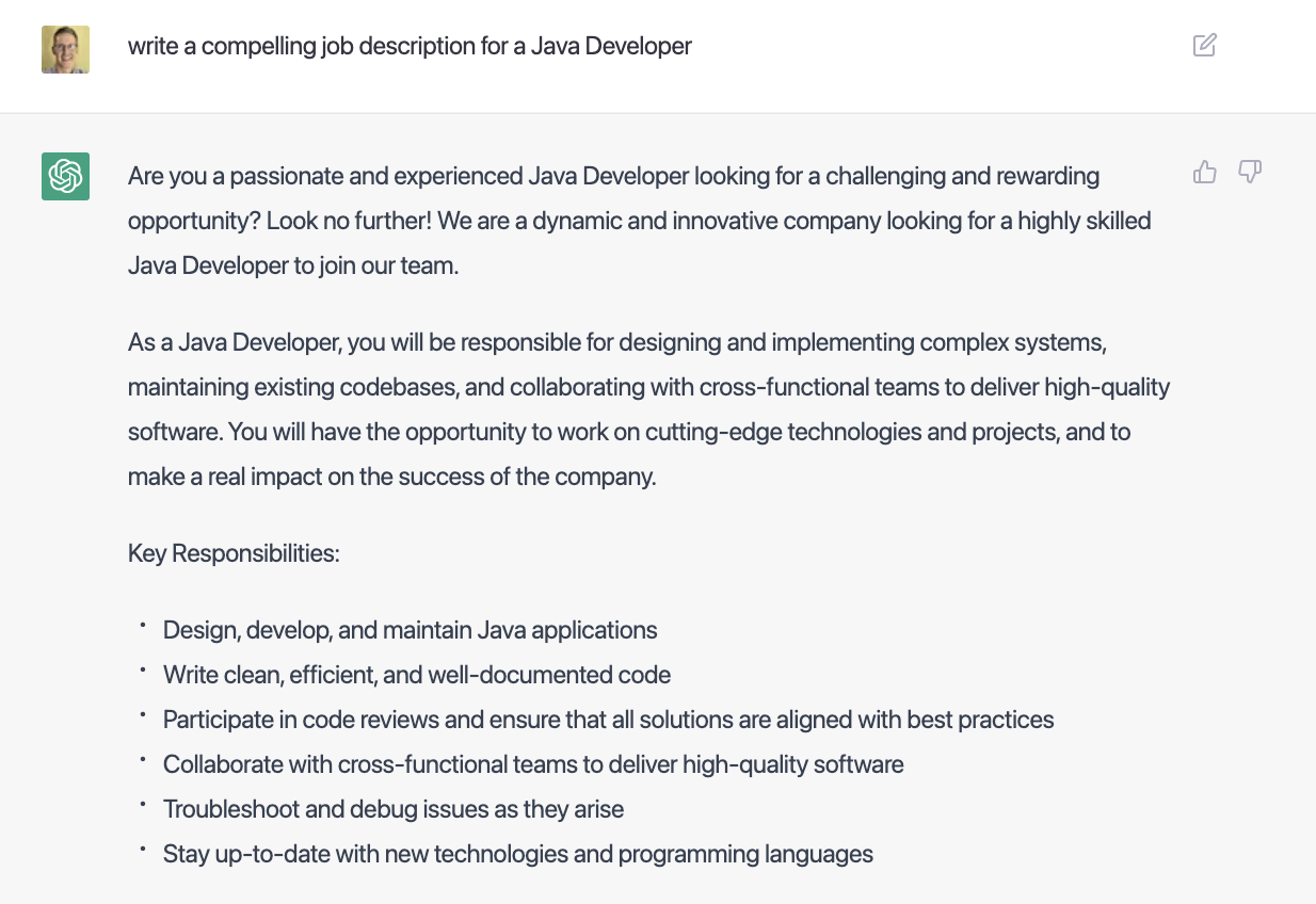 Di sinilah ChatGPT sangat berguna lantaran chatbot AI besutan OpenAI ini bisa membantumu menemukan informasi yang berguna dari deskripsi pekerjaan yang panjang. Cukup masukkan "Sorot 3 tanggung jawab paling penting dari deskripsi pekerjaan ini:" diikuti dengan deskripsi pekerjaan, dan saksikanlah chatbot bekerja dengan keajaiban AI-nya dalam hitungan detik untuk memberikan ringkasan yang sesuai.