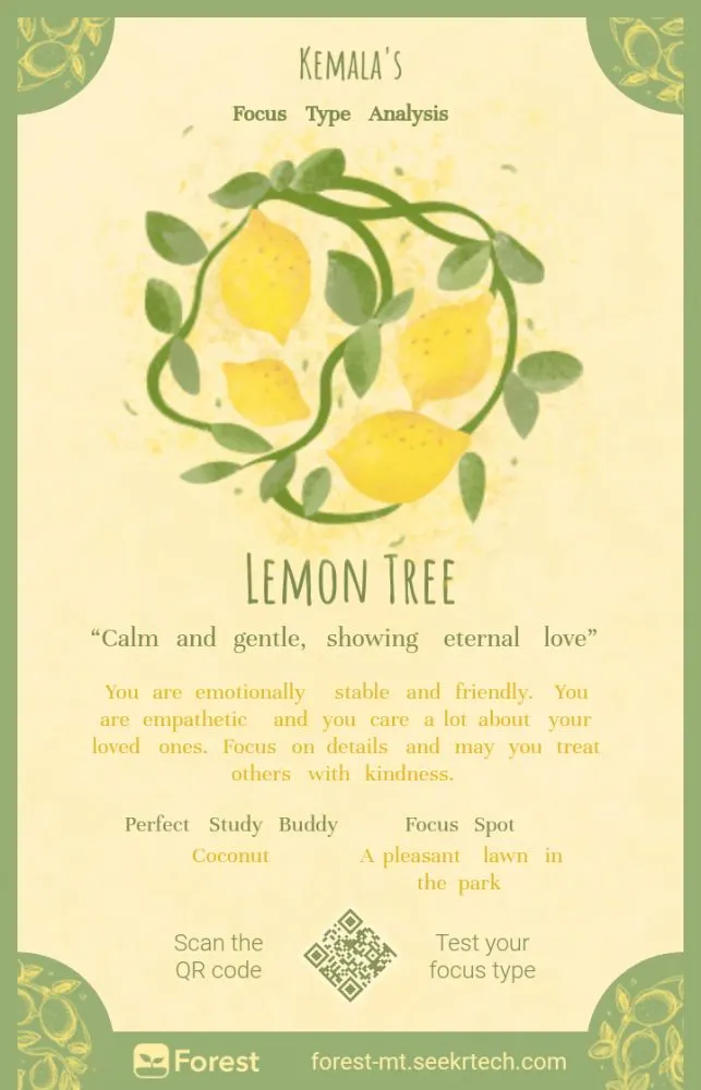 Selain itu, ia juga orang yang empatik dan sangat peduli dengan orang yang dicintai. Orang-orang dengan kepribadian Lemon Tree disebut fokus pada detail. Dalam hasil tes juga diprediksi "Perfect Study Buddy" untuk Lemon Tree, yaitu Coconut dan "Focus Spot" untuk Lemon Tree adalah "A pleasant lawn in the park". Hasil tes ini tentunya akan berbeda-beda untuk setiap orang tergantung pada jawaban yang disubmit dalam setiap pertanyaan yang ada.