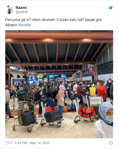 Netizen pun menganggap upaya masyarakat yang tetap disiplin dalam menerapkan kebijakan social distancing, physical distancing, hingga PSBB menjadi sia-sia karena tindakan para penumpang tersebut.