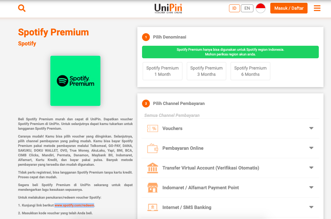 - Kunjungi halaman pembelian voucher Spotify Premium di UniPin.