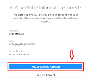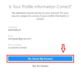 Selanjutnya, klik “Secure Your Account Here” agar akun dapat diamankan dan juga akan diarahkan pada halaman pemulihan akun. Kalian akan diarahkan pada penyataan bahwa “Apakah informasi yang diberikan sudah benar?”. Untuk bagian ini silakan pilih “No, Secure My Account”.