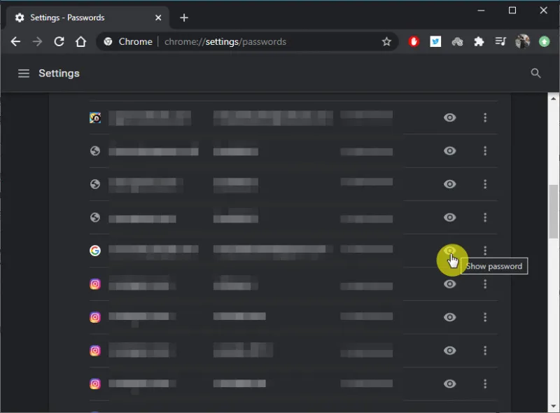 4. Akan muncul daftar akun yang tersimpan di Google Chrome, klik pada icon mata untuk melihat password