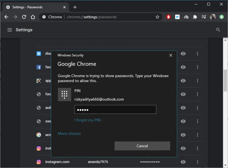 5. Masukan PIN atau password (tergantung dari metode user login pada Windows yang kamu pilih) pada jendela Windows security. Setelah proses selesai, maka kamu bisa melihat password dari akun terkait