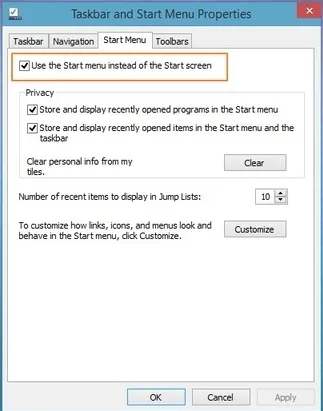 2. Klik tab Start Menu dan hilangkan centang menu Use the Start Menu instead of the Start Screen