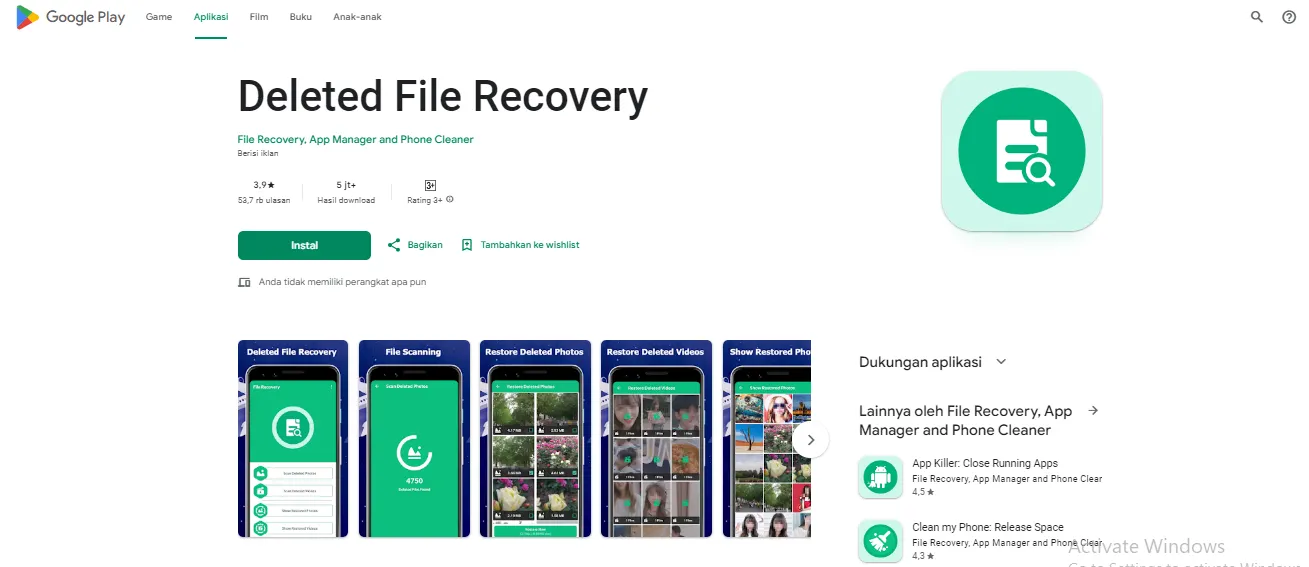 Terakhir kamu bisa menggunakan aplikasi file recovery di Play Store. Salah satunya kamu bisa menggunakan Aplikasi bernama Deleted File Recovery, bisa membantu kamu mengembalikan foto yang dihapus dan video yang dihapus. Berikut adalah langkah-langkahnya: