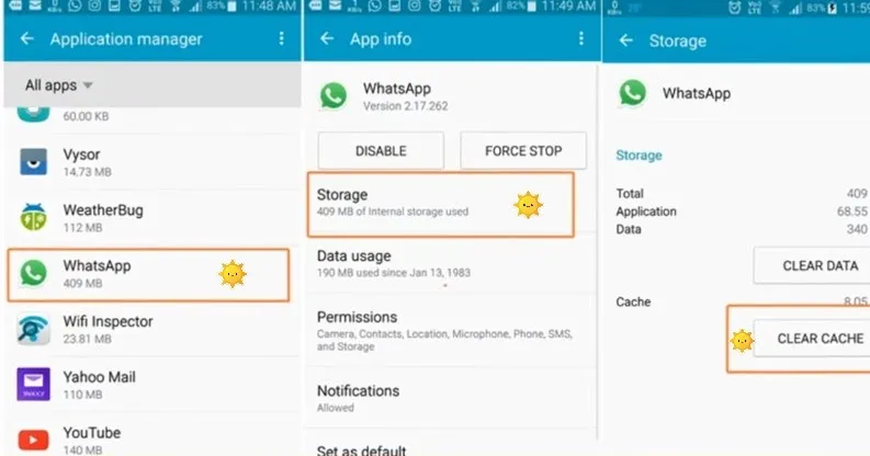 - Pilih Storage. Kemudian hapus cache WA dengan menekan tombol Clear Cache